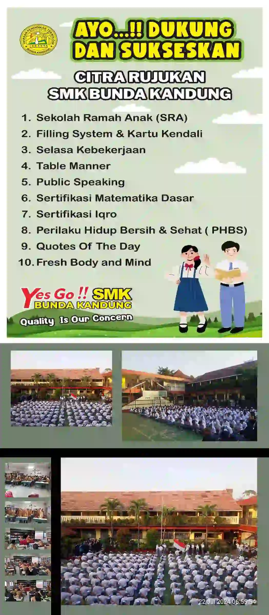 SMK BUNDA KANDUNG telah berdiri sejak tahun 1964 sampai sekarang, memiliki gedung sendiri yang nyaman dan asri berada di lingkungan perumahan yang nyaman pula, di dalam Kompleks Pertanian Pasar Minggu, tepatnya di Jl. Palapa Raya No. 3 Pasar Minggu, Jakarta Selatan Telpon : (021)7805248.