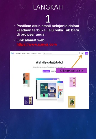 LANGKAH 1 • Pastikan akun email belajar.id dalam keadaan terbuka, lalu buka Tab baru di browser anda. • Link alamat web : https://www.canva.com Klik tombol Log in