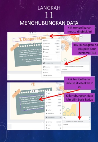 LANGKAH 11 MENGHUBUNGKAN DATA Klik tombol kanan mouse di objek ini Klik Hubungkan data lalu pilih baris pertama (T1) Klik tombol kanan mouse di objek ke 2 ini Klik Hubungkan data lalu pilih baris kedua