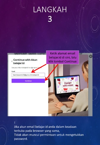 LANGKAH 3 Ketik alamat email belajar.id di sini, lalu klik tombol Continue ! Jika akun email belajar.id anda dalam keadaan terbuka pada browser yang sama, Tidak akan muncul permintaan untuk mengetukkan password.